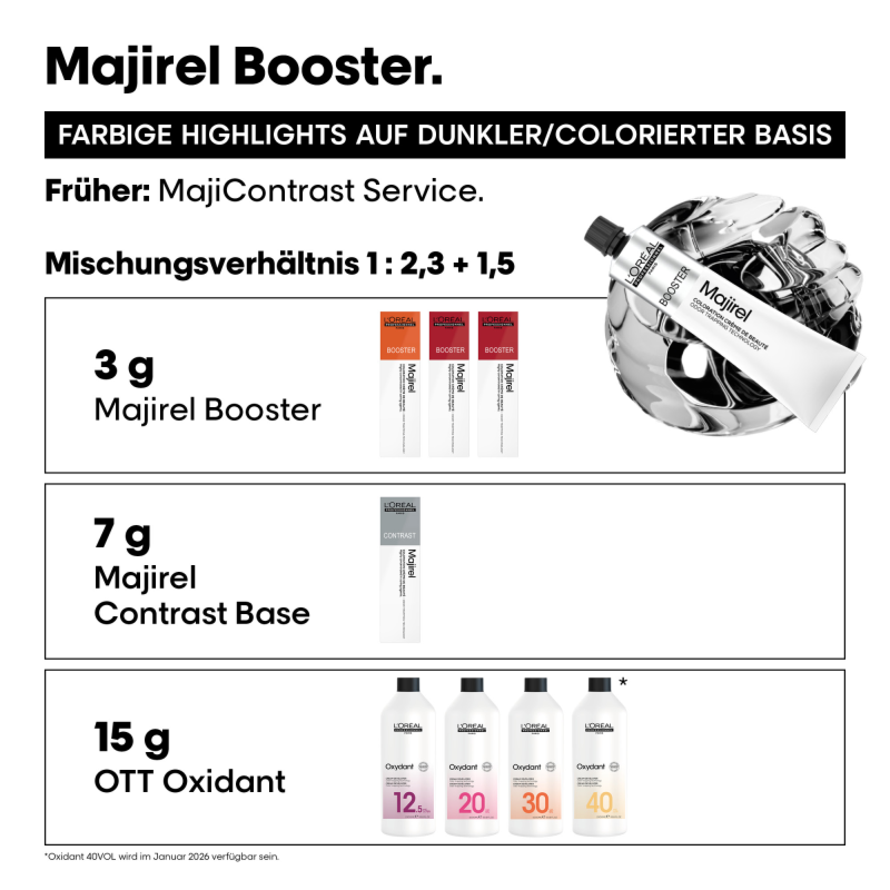 Die Booster werden immer in Kombination mit einer Majirel-Nuance und dem passenden Oxidant (12,5Vol, 20Vol oder 30Vol) angewendet. Auf Ansatz, Längen und Spitzen auftragen und 35 Minuten ohne Wärme einwirken lassen. Nach der Einwirkzeit sorgfältig emulgieren, gründlich ausspülen und das passende Pflegeprotokoll (z. B. Metal DX oder Vitamino Color Spectrum) anwenden.